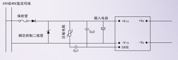 根據(jù)模塊電源實(shí)際的工作環(huán)境及用戶對(duì)可靠性的要求,可以選擇輸入保護(hù)電路,以提高電源系統(tǒng)的可靠性,輸入 保護(hù)電路由保險(xiǎn)絲、反極性保護(hù)二極管、輸入電容、瞬態(tài)抑制二極管等組成,常用的輸入保護(hù)電路如圖所示: