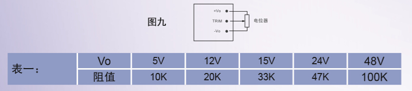 3. 調(diào)整端的應(yīng)用 本公司電源產(chǎn)品是具有調(diào)整端(TRIM)的產(chǎn)品,可以通過電阻或電位器對(duì)輸出電壓進(jìn)行一定范圍內(nèi)輸出電壓的調(diào) 整。將電位器的中心與TRIM相連,其它兩端分別接+S,-S端子,沒有+S,-S端子的情況下,可將兩端分別接到相應(yīng) 的主路的輸出正負(fù)極上,如圖九所示,調(diào)節(jié)電位器即可微調(diào)輸出電壓。電位器的阻值的選擇請(qǐng)參考表一。