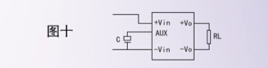 4. 輔助電容端的應(yīng)用 由于電源模塊體積的限制,內(nèi)部不可能接入較大的濾波電容,為進(jìn)一步改善參數(shù),我公司的部分產(chǎn)品設(shè)有輔助電 容端AUX,用戶可在電源外部靠近AUX端加一只優(yōu)質(zhì)電解電容,以提高濾波效果改善電源的參數(shù)。接線如圖十所示
